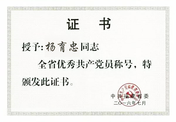 楊育忠同志榮獲“福建省優(yōu)秀共產(chǎn)黨員”稱(chēng)號