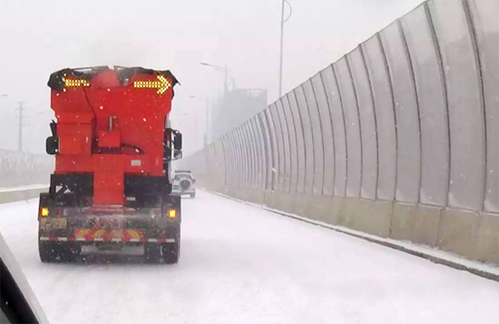 吹雪機進(jìn)行中間護欄吹雪作業(yè)