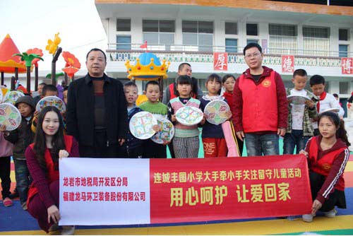12月18日,由龍巖義工俱樂(lè )部、龍巖青年志愿者協(xié)會(huì )、龍巖地稅局開(kāi)發(fā)區分局主辦,福建龍馬環(huán)衛裝備股份有限公司協(xié)辦的連城豐圖小學(xué)大手牽小手關(guān)注留守兒童“用心呵護、讓愛(ài)回家”愛(ài)心物資捐贈公益活動(dòng)在豐圖小學(xué)拉開(kāi)了序幕。龍馬環(huán)衛黨支部為該校218名兒童捐贈了文具、保溫杯、跳繩等學(xué)習、生活用品,為孩子撐起一片愛(ài)的天空。