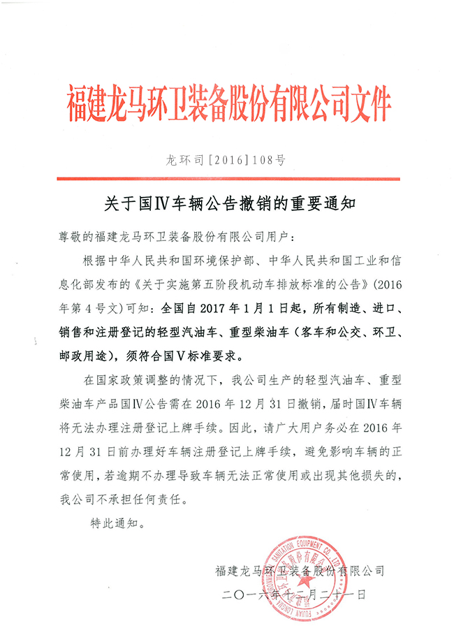 關(guān)于國Ⅳ車(chē)輛公告撤銷(xiāo)的重要通知 2016-12-22 1462 分享 上一條 ?龍馬環(huán)衛亮相“福建品牌海絲行”(柬埔寨站)展會(huì ) 福建省外辦黨組書(shū)記王天明蒞臨現場(chǎng)指導2016-12-21 下一條 福龍馬集團2024年售后服務(wù)萬(wàn)里行活動(dòng)盛大起航2024-08-07