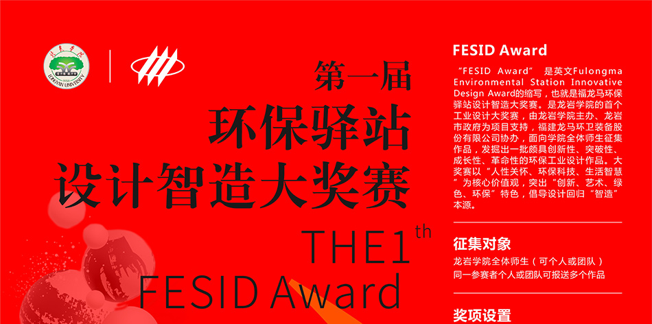 “FESID Award” 是英文 Fulongma Environmental Station Innovative Design Award 的縮寫(xiě),也就是福龍馬環(huán)保驛站設計智造大獎賽。是龍巖學(xué)院的首個(gè)工業(yè)設計大獎賽,由龍巖學(xué)院主辦、龍巖市政府為項目支持,福建龍馬環(huán)衛裝備股份有限公司協(xié)辦,面向學(xué)院全體師生征集作品,發(fā)掘出一批頗具創(chuàng )新性、突破性、成長(cháng)性、革命性的環(huán)保工業(yè)設計作品。大獎賽以“人性關(guān)懷、環(huán)??萍?、生活智慧”為核心價(jià)值觀(guān),突出“創(chuàng )新、藝術(shù)、綠色、環(huán)?!碧厣?,倡導設計回歸“智造”本源。
