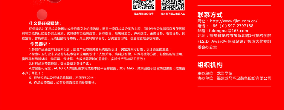 地址:福建省龍巖市東肖北路1號 龍巖學(xué)院 FESID Award 環(huán)保驛站設計智造大獎賽組委會(huì )辦公室