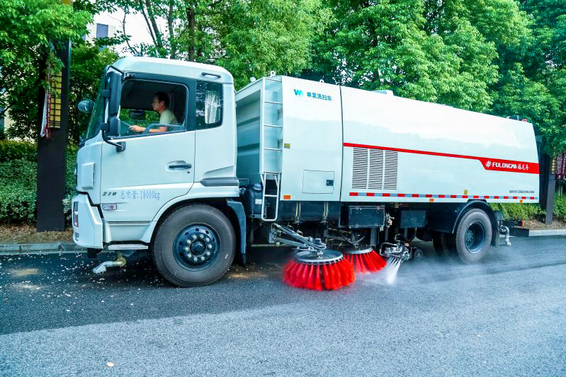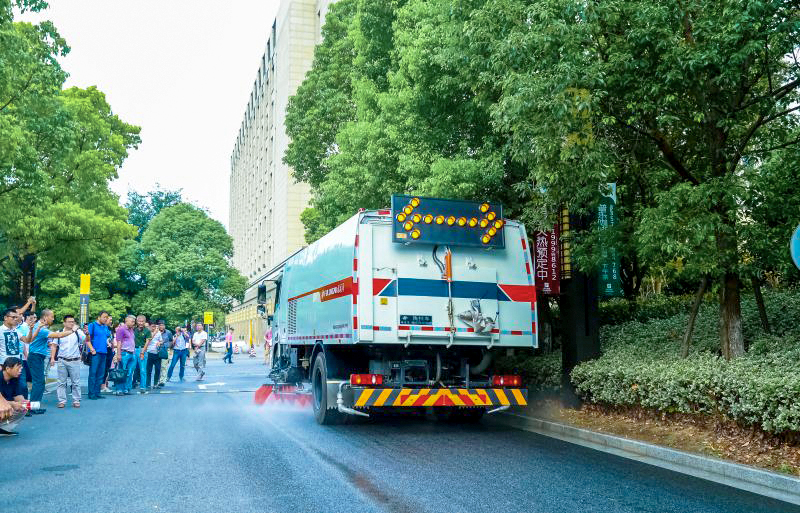 嘉賓現場(chǎng)觀(guān)摩單發(fā)動(dòng)機洗掃車(chē)、高壓清洗車(chē)作業(yè)