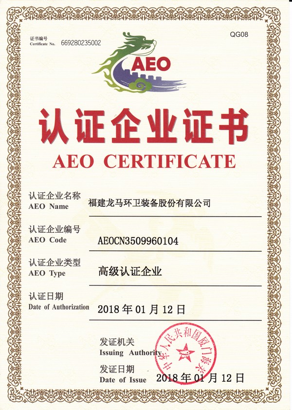 2018年1月12日,福建龍馬環(huán)衛裝備股份有限公司獲得了由廈門(mén)海關(guān)頒發(fā)的高級認證企業(yè)證書(shū)。中華人民共和國海關(guān)總署于2014年11月頒布了全新的《海關(guān)認證企業(yè)標準》,龍馬環(huán)衛是龍巖市首家申請高級認證并通過(guò)的企業(yè)。該認證的通過(guò)體現了龍馬環(huán)衛在企業(yè)內部控制、財務(wù)狀況、守法規范、貿易安全等方面已經(jīng)達到了較高的水平,并獲得了海關(guān)的認可,同時(shí)也標志著(zhù)公司在響應國家“一帶一路”的號召,與國際接軌、將福龍馬品牌推向世界的路上又跨出了新的一步。