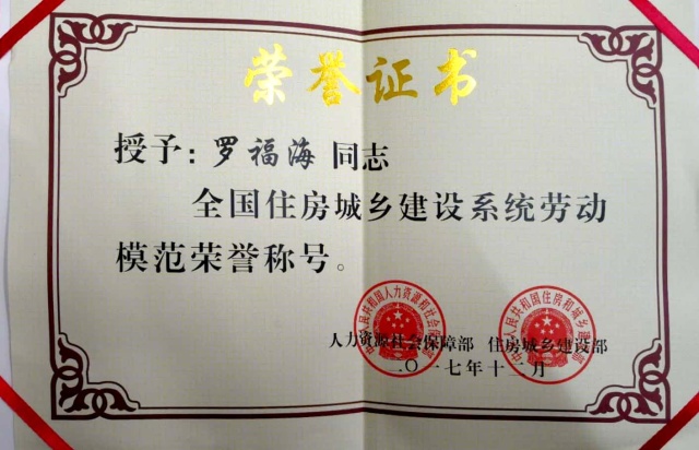 ??邶堮R環(huán)衛環(huán)境工程有限公司總經(jīng)理羅福海被評為“全國住房城鄉建設系統勞動(dòng)模范”