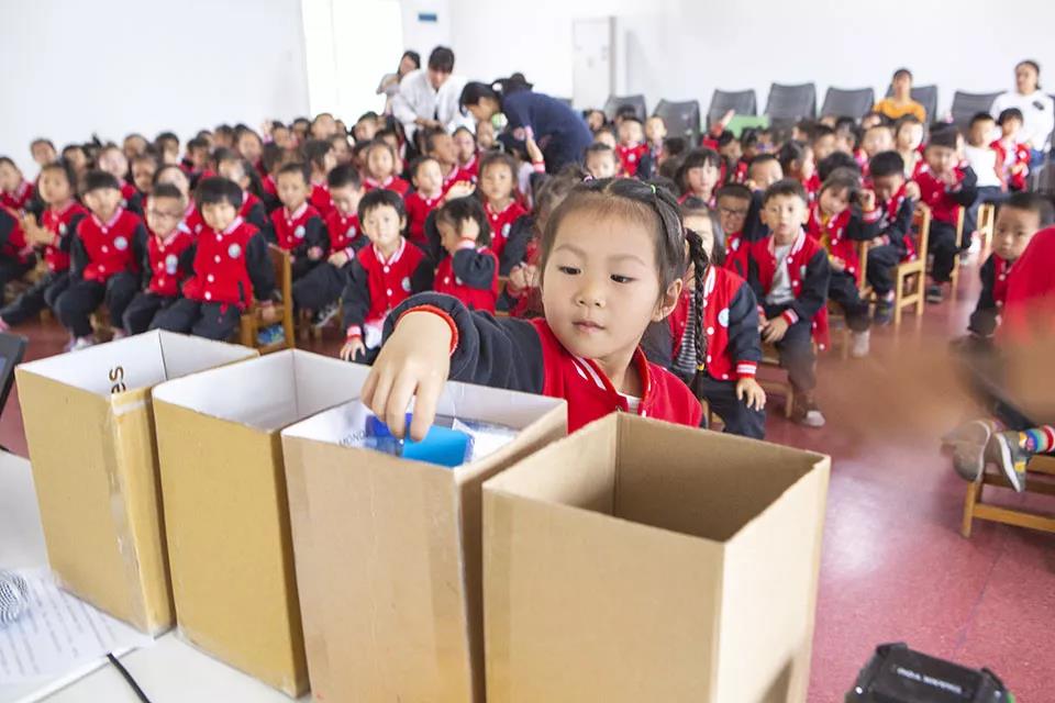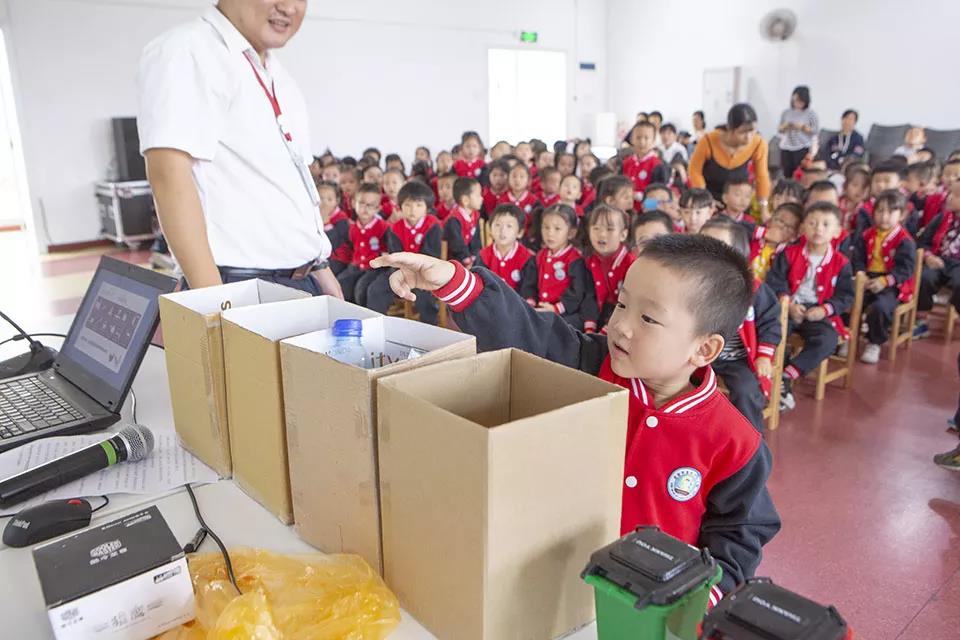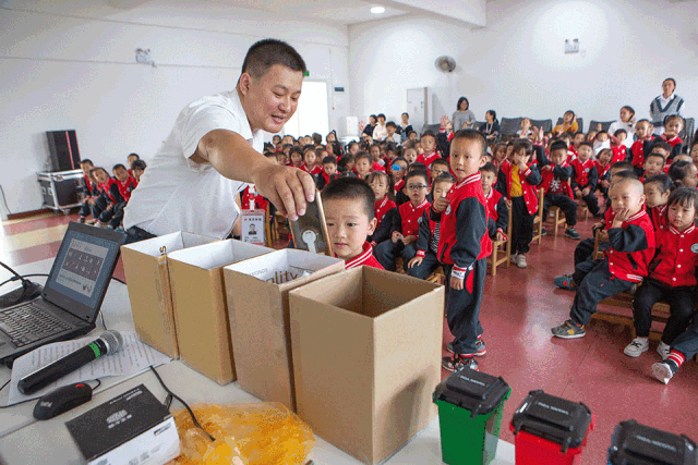 “叔叔,這個(gè)本子放哪個(gè)箱子里呢?”小朋友舉著(zhù)杯子在現場(chǎng)提問(wèn),進(jìn)校宣講員耐心指引,手把手教孩子們識別垃圾的類(lèi)別,正確做到垃圾分類(lèi)。