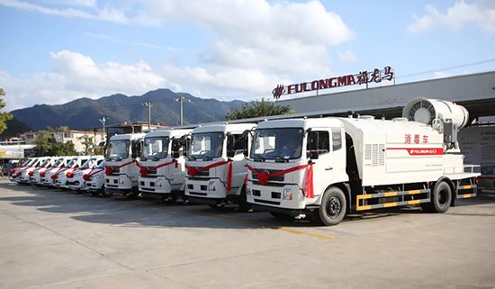 捐贈的18臺“福龍馬”牌環(huán)衛消毒專(zhuān)用車(chē)整裝待發(fā)