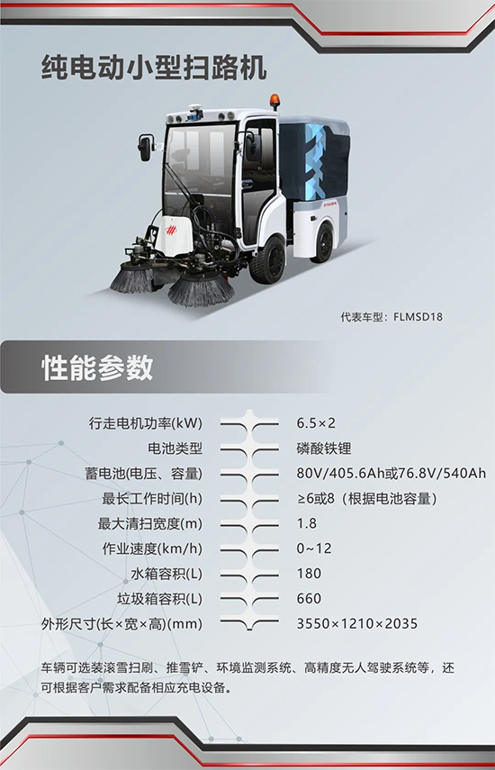 FLMSD18純電動(dòng)掃路機是龍馬環(huán)衛全新開(kāi)發(fā)、性能領(lǐng)先于行業(yè)的智能化清掃設備,具有路面清掃、高壓水清洗、污水循環(huán)利用等功能。整機造型美觀(guān),機動(dòng)靈活,清掃能力強,是環(huán)衛裝備智能化發(fā)展中的標桿產(chǎn)品。