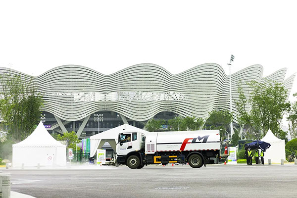 2014年,南京青奧會(huì ),“福龍馬”牌洗掃車(chē)在場(chǎng)館前做道路保潔保障服務(wù)工作