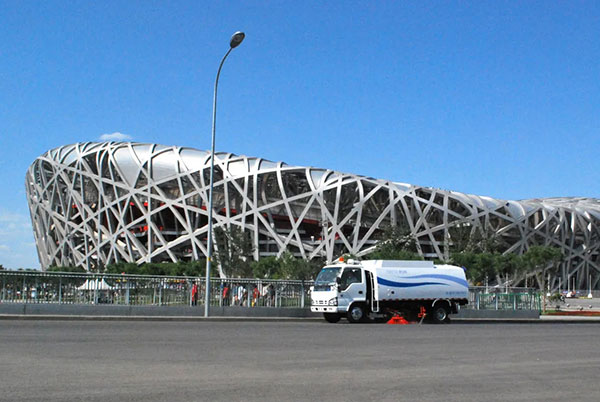 2008年,北京奧運會(huì ),“福龍馬”牌環(huán)衛車(chē)輛在鳥(niǎo)巢前作業(yè)