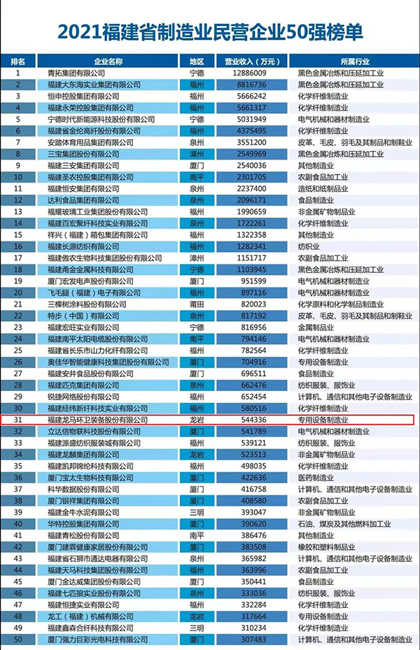 會(huì )上,省委統戰部副部長(cháng)、省工商聯(lián)黨組書(shū)記李家榮發(fā)布了2021福建省民營(yíng)企業(yè)100強榜單,其中龍馬環(huán)衛同時(shí)獲得“2021福建省民營(yíng)企業(yè)100強(排名第68位)”“2021福建省創(chuàng )新型民營(yíng)企業(yè)100強(排名第40位)”“2021福建省民營(yíng)企業(yè)制造業(yè)50強(排名第31位)”三項殊榮。上述榮譽(yù)的獲得,體現了社會(huì )各界對龍馬環(huán)衛綜合實(shí)力、環(huán)衛裝備制造實(shí)力和技術(shù)創(chuàng )新實(shí)力的充分肯定和高度認可。今后,龍馬環(huán)衛將繼續以習近平總書(shū)記“綠水青山就是金山銀山”的生態(tài)文明理念為指引,進(jìn)一步加大研發(fā)投入、提升工藝水平、拓展產(chǎn)業(yè)鏈條、聚焦主責主業(yè),努力發(fā)展成為環(huán)境衛生整體解決方案領(lǐng)先者,積極為中國環(huán)境衛生事業(yè)高質(zhì)量發(fā)展添磚加瓦。