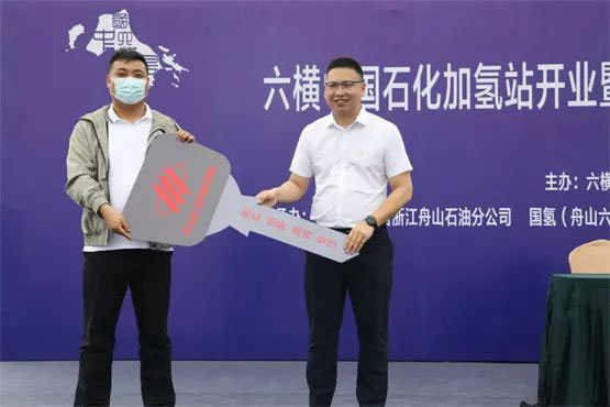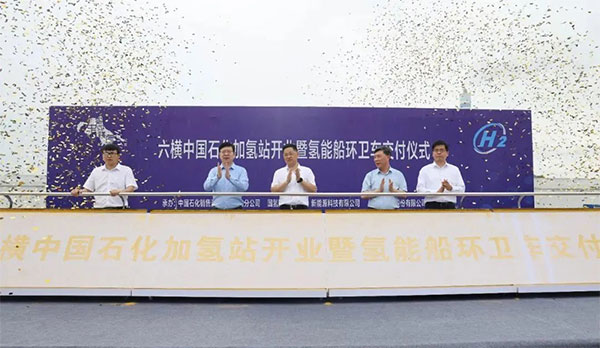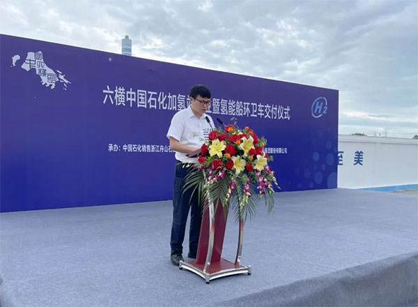 6月1日上午,六橫中國石化加氫站開(kāi)業(yè)暨氫能船、環(huán)衛車(chē)交付儀式在六橫氫能產(chǎn)業(yè)園舉行,管委會(huì )副主任呂輝及中國石化舟山石油分公司、福龍馬集團股份有限公司、深圳國氫新能源科技有限公司、國氫(舟山六橫)新能源科技有限公司、浙江中創(chuàng )量云船舶科技有限公司等企業(yè)負責人共同為加氫站揭牌。