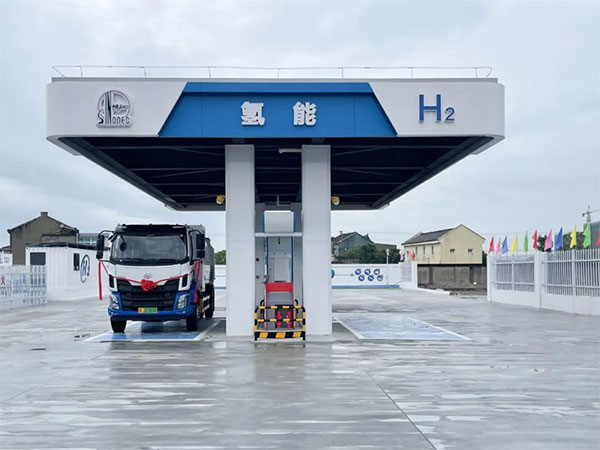 “福龍馬”牌氫能源壓縮式垃圾車(chē)在加氫站中等待加氫
