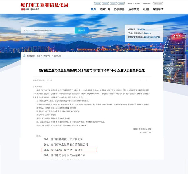 福建龍馬環(huán)境產(chǎn)業(yè)有限公司成功入選廈門(mén)市“專(zhuān)精特新”企業(yè)名單