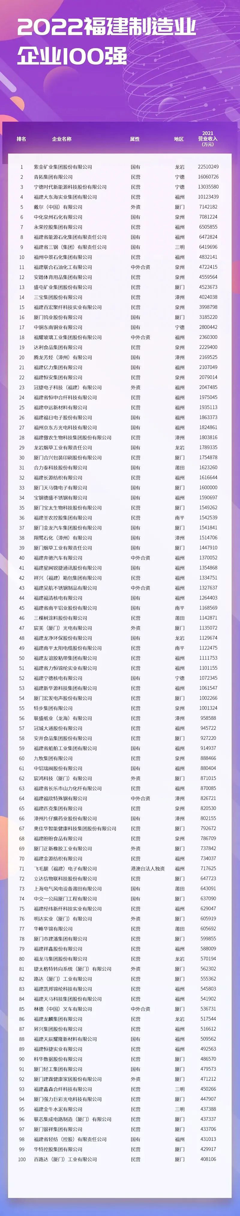 日前,2022福建企業(yè)100強發(fā)布大會(huì ),發(fā)布了2022福建企業(yè)100強、福建制造業(yè)企業(yè)100強、福建服務(wù)業(yè)企業(yè)100強、福建戰略性新興產(chǎn)業(yè)企業(yè)100強四個(gè)榜單。這是福建省持續樹(shù)立大型企業(yè)標桿,發(fā)揮大型企業(yè)龍頭帶動(dòng)作用,有效促進(jìn)我省企業(yè)做大做強,依照中國企業(yè)聯(lián)合會(huì )研究發(fā)布“中國企業(yè)500強”的做法,經(jīng)評審委員會(huì )審定,福龍馬集團獲得“2022福建省制造業(yè)企業(yè)100強(排名第80位)”殊榮。