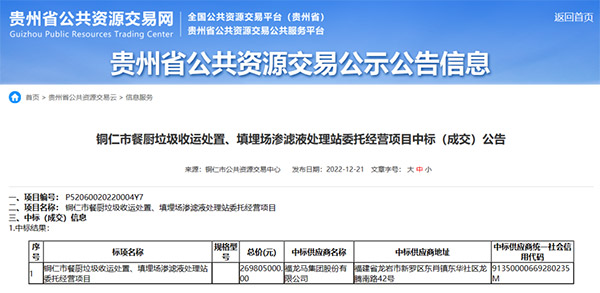 年關(guān)將至傳捷報,策馬揚鞭正當時(shí)。近日,福龍馬集團旗下業(yè)務(wù)板塊龍馬環(huán)境科技又迎來(lái)了一中標喜訊,繼長(cháng)汀項目之后,公司于2022年12月21日以2.698億成功中標銅仁市餐廚垃圾收運處置、填埋場(chǎng)滲濾液處理站委托經(jīng)營(yíng)項目,項目運營(yíng)期30年。該項目主要處理銅仁市餐廚垃圾及配套填埋場(chǎng)滲濾液,處理規模為餐廚垃圾100t/d、滲濾液80t/d,主體工藝采用“預處理+厭氧+污水處理”。